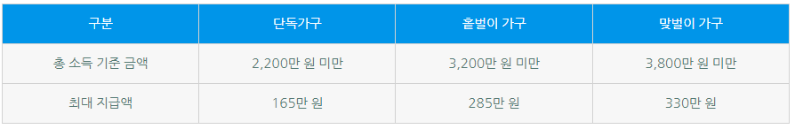 ● 단독가구 최대 지급액: (총금여액 2,200만원 미만인 경우) 165만원